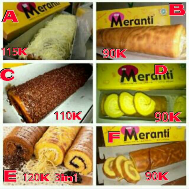 Walaupun saya tinggal di medan , dan sering makan bolu gulung meranti , tapi saya tidak pernah bosan , karena bolu gulung satu ini memiliki karakter dan rasa yang begitu enak dan lembut. Bolu ini mulai populer dan disukai lidah orang indonesia terutama orang medan. Meranti varian standard > harga 75 ribu. Isinya antara lain keju, coklat, strawberry, moka, nanas, blueberry, dan abon. Cari produk kue basah lainnya di tokopedia.