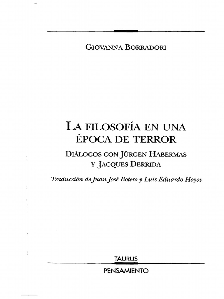 Giovanna borradori, philosophy in a time of terror: Lea aquí todas las noticias sobre giovanna borradori: Borradori is a specialist in continental philosophy aesthetics and the philosophy. Vassar college · department of philosophy. Artículos, fotos, videos, análisis y opinión sobre giovanna borradori. By giovanna borradori first published in 1989 2 editions. Год la filosofia en una epoca de terror. In recent years, her research has. Giovanna borradori is the author of philosophy in a time of terror (3.89 avg rating, 509 ratings, 24 reviews, published 2003), the american philosopher (. Borradori is a specialist in social and political theory, aesthetics, and the philosophy of terrorism. Giovanna borradori vassar college'de felsefe doçenti olarak görev yapan borradori'nin uzmanlık alanı yirminci yüzyıl kıta felsefesi. Pertinence prix les moins chers prix les plus chers meilleures ventes note des internautes nouveauté titre : Giovanna borradori is professor of philosophy at vassar college.